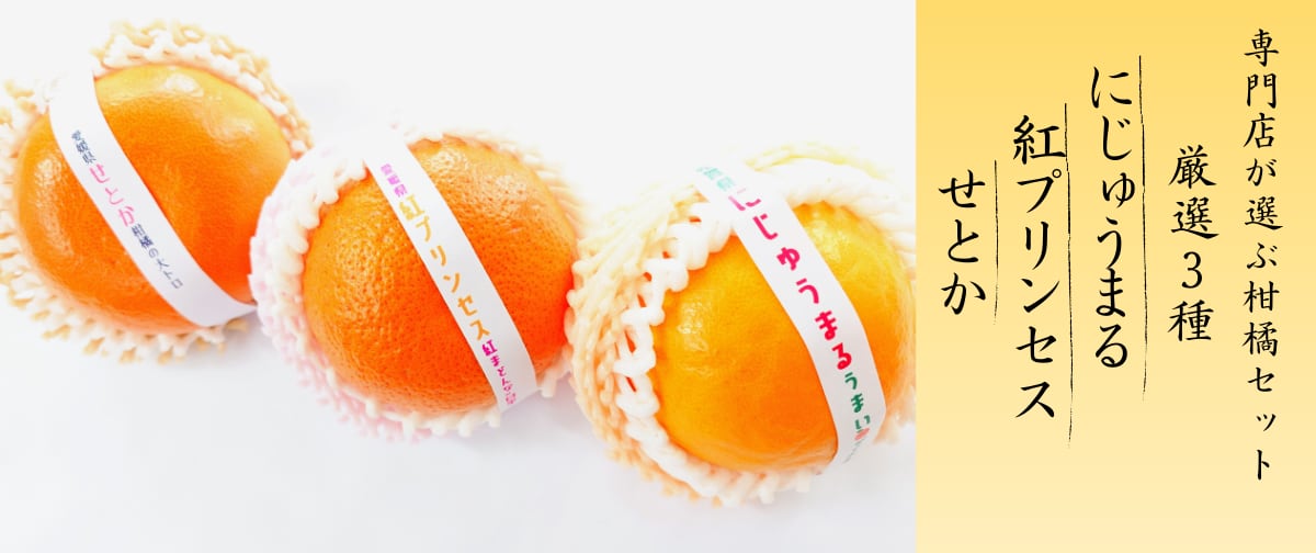 専門店だからできる3種の詰め合わせ! 【果物専門店が選ぶ『旬の柑橘3種セット』紅プリンセス・せとか・にじゅうまる】 1箱(9個※各3個入り) ※包装・御熨斗無料 ※サイズにより入り数が前後する可能性がございます。 ※サイズのご指定はご遠慮ください。 専門店だからできる今おすすめしたいかんきつセットをお届けいたします。 旬を迎えているかんきつの中から『紅プリンセス・せとか・にじゅうまる』を厳選し お詰めいたします。 【愛媛県産 紅プリンセス】 愛媛ブランド!期待の新品種『紅プリンセス』 人気のかんきつである『紅まどんな×甘平』の夢のような掛け合わせで生まれました。 紅まどんなのとろけるゼリーのような食感。 甘平の濃厚な甘み。その二つを併せ持つ新しい柑橘です。 柑橘界のサラブレッドともいわれる『紅プリンセス』は流通量も少なく、貴重な一品です。 【愛媛県産 せとか】 外皮の美しさからも、贈答用の果物として人気の高い『せとか』。 果汁が豊富で甘味がつよく、なんといってもそのコクは他の柑橘では味わえない美味しさです。やわらかくトロける果肉と香りをぜひ、ご堪能くださいませ。 【佐賀県産 にじゅうまる】 佐賀県が20年以上かけて開発して新品種『にじゅうまる』 佐賀を代表する新ブランドの『にじゅうまる』はぷちっとした食感と 濃厚な甘さ、溢れる果汁がたまらないかんきつです。 見た目、香り、甘さ、果汁、食感。どれをとってもにじゅうまる。 佐賀県が「胸を張って、うまい」と豪語する、この時期だけの限定柑橘です。 今だけの特別なセットをぜひ、ご進物にご利用くださいませ。